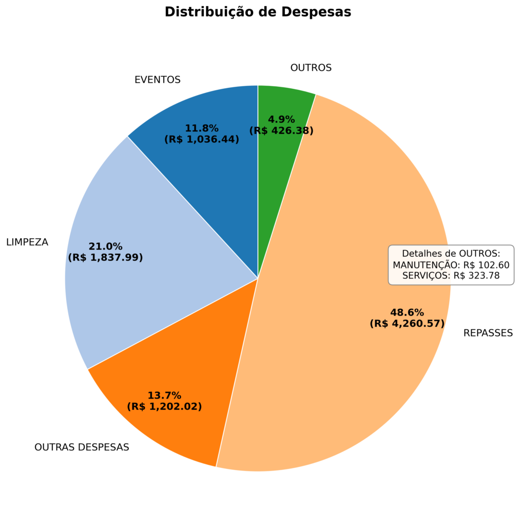 No campo das despesas, observa-se a permanência de investimentos em eventos, incluindo custos com estrutura e insumos, como palco, além de gastos pontuais como fotografia da semana de recepção e materiais diversos. Essas ações seguem sendo centrais para a integração estudantil e para a construção do ambiente universitário.