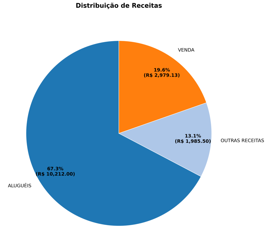 No que diz respeito às receitas, março apresentou um fluxo bastante positivo. A principal fonte continua sendo os aluguéis, que juntos representam a maior parcela da arrecadação. Além disso, houve uma entrada consistente de recursos por meio de vendas ao longo de todo o mês de produtos vendidos , indicando a continuidade da circulação financeira iniciada em fevereiro. Também aparecem receitas adicionais e pequenos rendimentos financeiros.