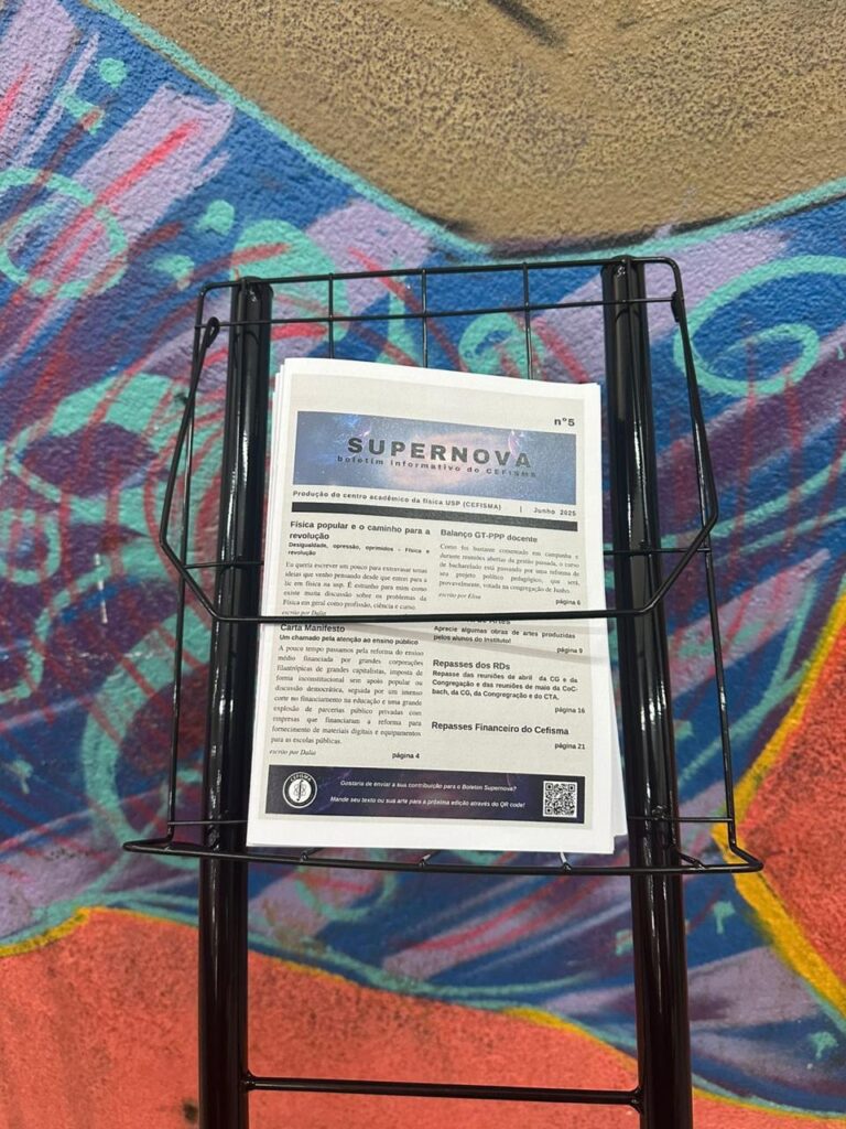 O mês de junho, ainda agitado, foi marcado por mais eventos locais. Neste mês, temos a apresentação de dois Cafés com Quantum, a primeira edição impressa do Boletim Supernova, uma roda de conversa sobre “ENADE (exame nacional de desempenho de estudantes), NEM (novo ensino médio) e Ensino” e o Sarau do FísicAcolhe. Faço destaque ao FísicAcolhe pois, durante este ano de gestão, o CEFISMA Popular começou a se aproximar da equipe do acolhimento do IFUSP, de tal forma a fortalecer suas atividades e ser fortalecido por elas. Assim, em alguns encontros do FísicAcolhe, o CEFISMA comprou salgadinhos, chamou alunos para participarem e esteve presente; uma política que sempre achei muito importante.
