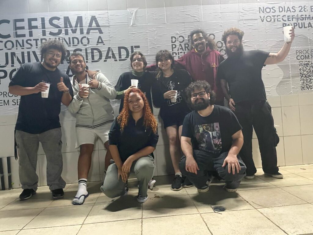 Começamos nossa jornada em abril de 2025, com o período eleitoral. Nas eleições do CEFISMA de 2024, houve somente a inscrição de uma chapa e, então, a memória que o corpo discente tinha das eleições do centro acadêmico era de serem uma formalidade. Os debates com uma única chapa não atraiam grande público e muitos não viam o sentido de votar nas eleições em que se tinha uma única opção (além do veto).
