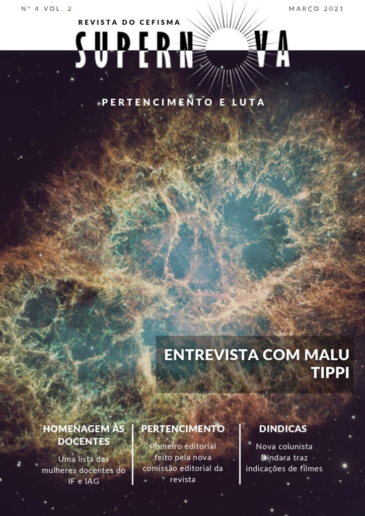De então, a equipe editorial vem inovando, colocando novas seções no Boletim SUPERNOVA a fim de incorporar, junto dos textos e artes produzidos pela comunidade IFUSPiana (muitos pelos próprios editores!), outras seções que acreditamos ser de interesse. Estamos trazendo problemas de matemática e física (por vezes propondo soluções), um mural de avisos (quando se mostra necessário) e, a novidade desta edição, um quadro de indicações/resenhas escrito pelos editores, o “Me Conta, SUPERNOVA!”.